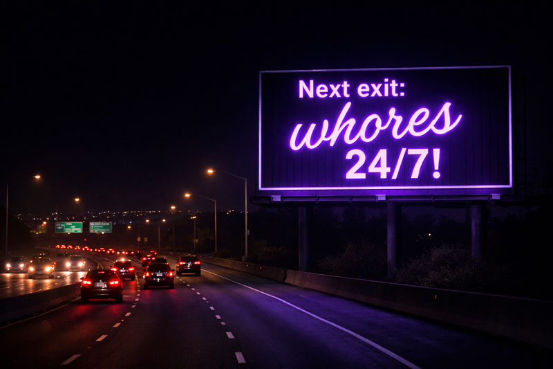 А если проституция, и бизнес, на ней построенный, легальны — стало быть, и реклама тоже легальна? И какую форму ей можно разрешить принимать? Огромные биллборды у федеральных трасс, «Только у нас! Бляди в режиме 24 на 7»? Тоже, наверное, нет.