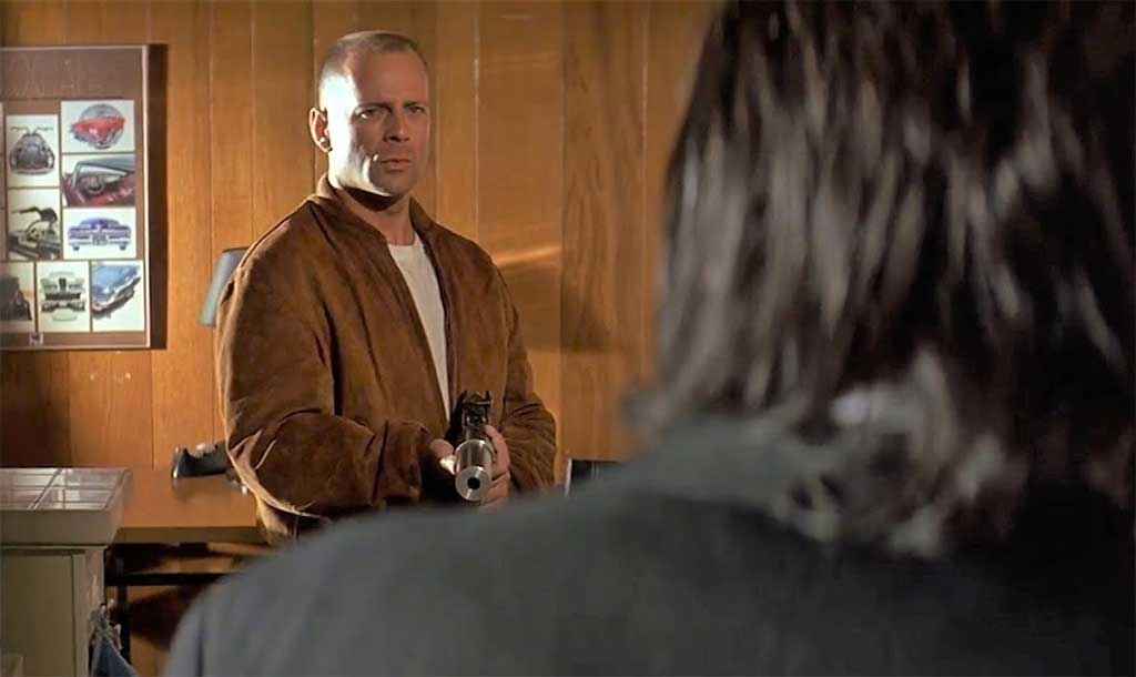 Он читал книжечку (кстати, ту самую, которую он брал с собой в уборную в дайнере — в сцене, с которой фильм и начинается), и, судя по всему, заседал там основательно и долго. Настолько долго, что Бутч успел не только осмотреться и взять часы отца, но и спокойно приготовить себе тост, пока Винсент был занят своим грязным делом.