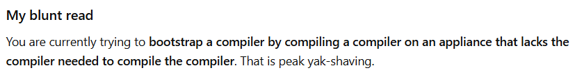 «Если честно, ты сейчас пытаешься поставить компилятор путём компиляции компилятора на устройстве, на котором нет компилятора, чтобы скомпилировать компилятор. Короче, ты занимаешься суходрочкой.»