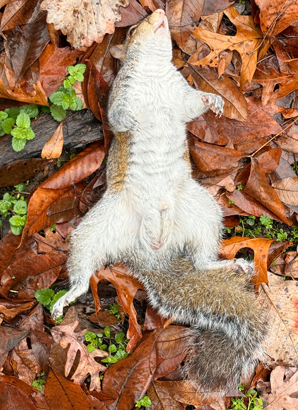 Продолжаю мстить белкам. Сегодня был ну прямо очень удачный день — удалось грохнуть аж троих сволочей. Холодно, дождик прошёл — видимо, у белок проснулся зверский аппетит, и они продолжали бегать по участку в поисках желудей и орехов. Даже несмотря на потери.