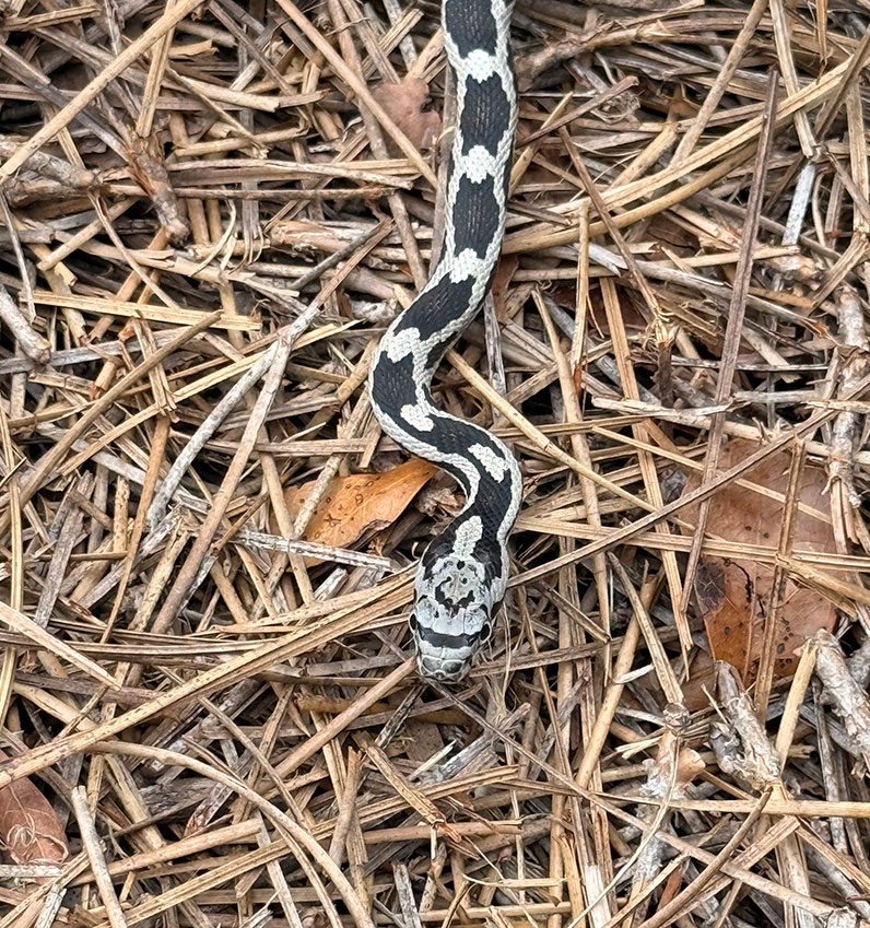 У нас пару лет назад жила здоровенная змея этой системы (eastern rat snake, не знаю, как по-русски), с меня длиной. Это, видимо, уже дети или внуки этой змеи пошли. Мелкая ещё, шириной с толстый фломастер типа “Шарпи”.