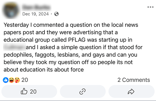 На скрине — местный экземпляр, который искренне поинтересовался, не означает ли PFLAG “педофилы, пидарасы, и гомосеки”, и возмутился, что его комментарий удалили.