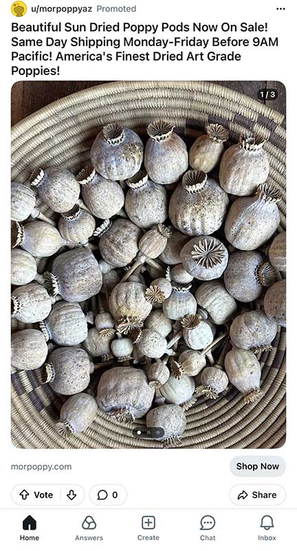 Какие, всё же, у нас долболомские законы в плане наркотиков. Кустами марихуаны владеть нельзя, это Schedule I, турма сидеть. А вот кустами мака владеть можно! И продавать маковую соломку в интернетах тоже можно. Art grade, ага-ага. Если арт-проект — это изготовление черняжки, то да, конечно.