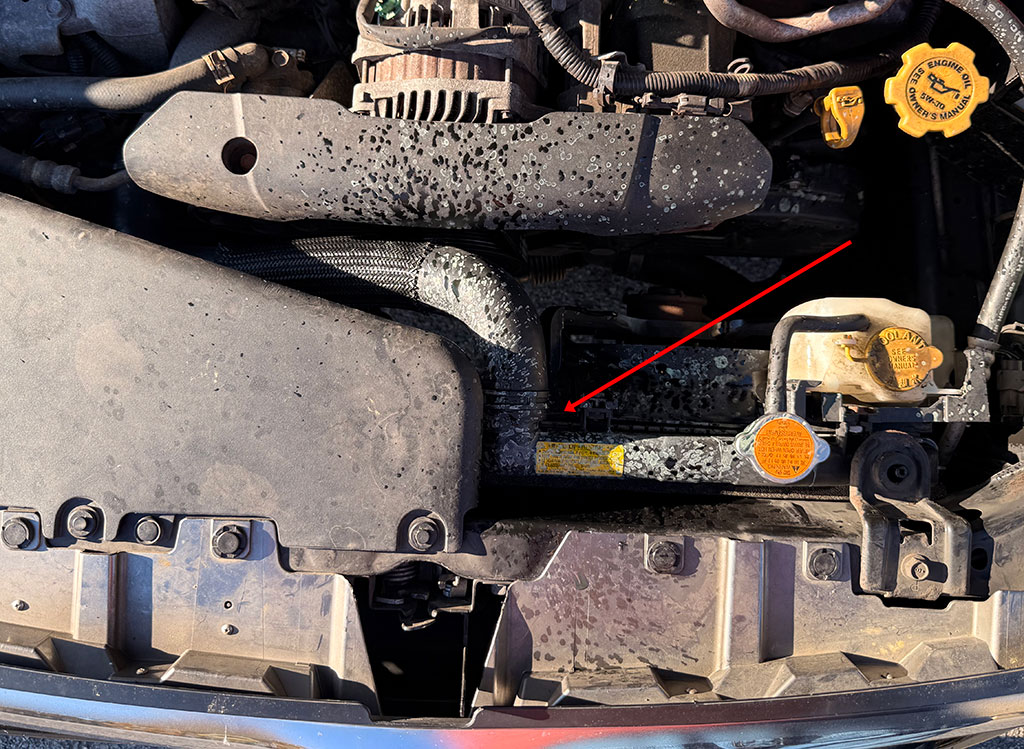 В принципе, откуда, было понятно практически сразу — из соединения между верхним шлангом и патрубком радиатора. Шланг был заменён, также был заменён пружинный хомут шланга.